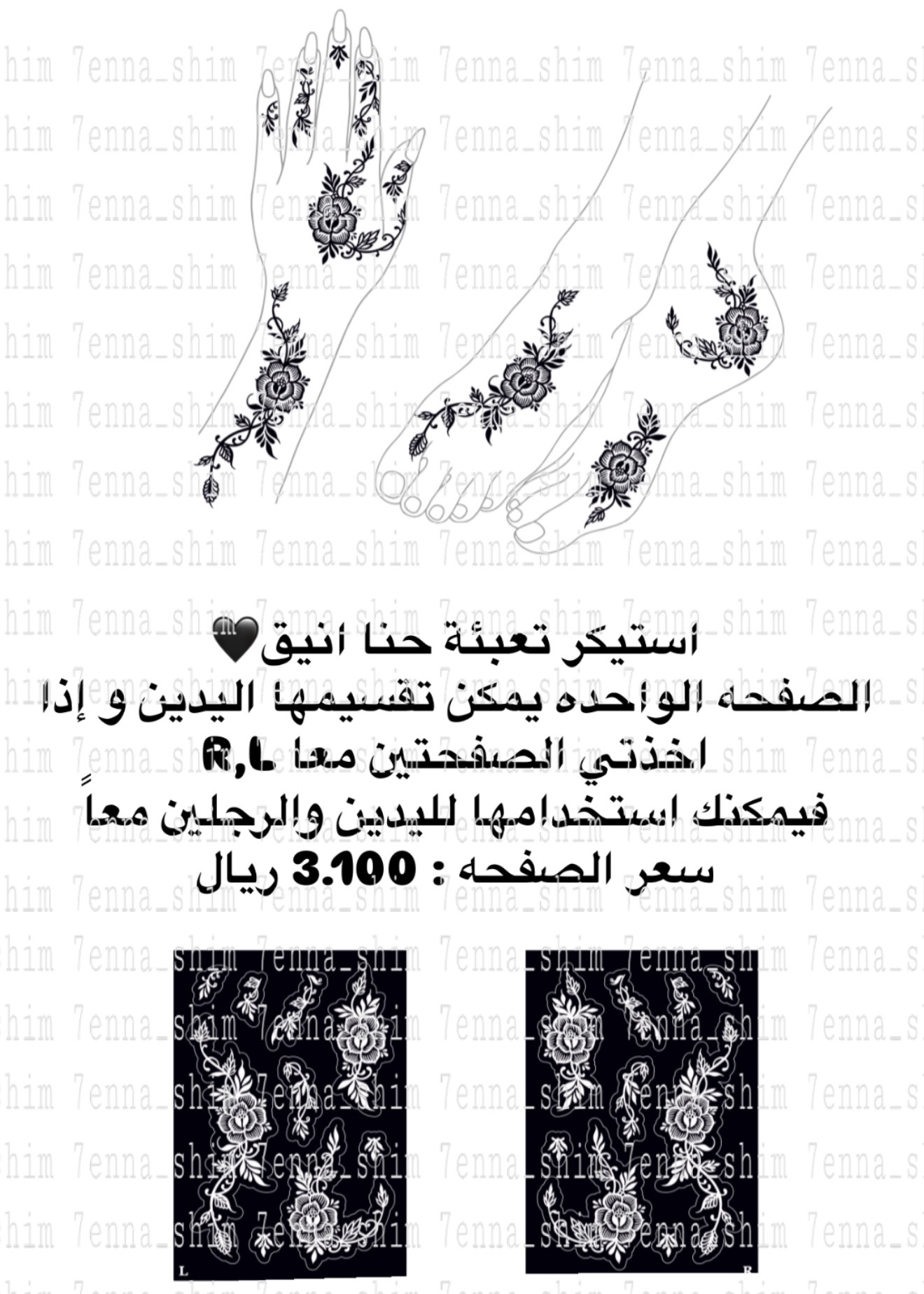 ‏Unique henna stencils ‏tow page(R,L) is enough for two adult hands with feet ,or you can use it for adult hands and kids